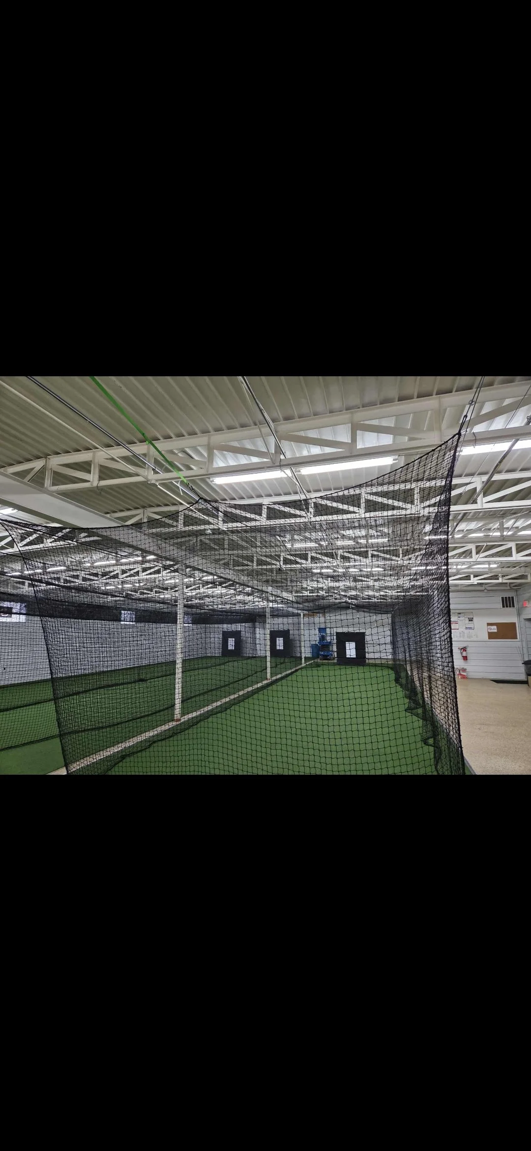 Indoor batting cage with green artificial turf floor and black netting on sides and ceiling