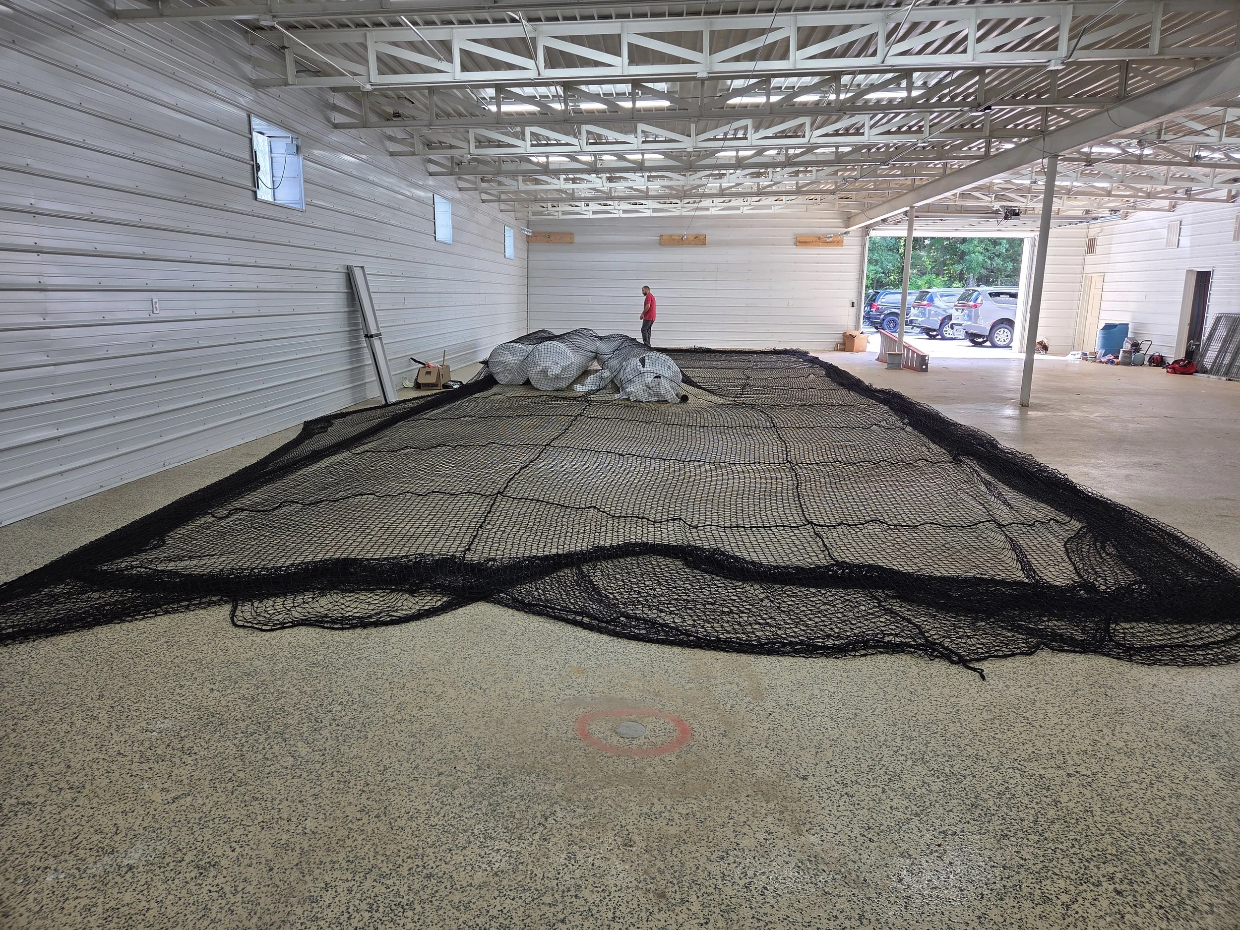 Interior of a spacious warehouse or workshop with white metal walls and ceiling. A large black net is spread out on the floor, and some sacks and equipment are placed at the far end. A person in a red shirt is standing near the sacks, and there is an